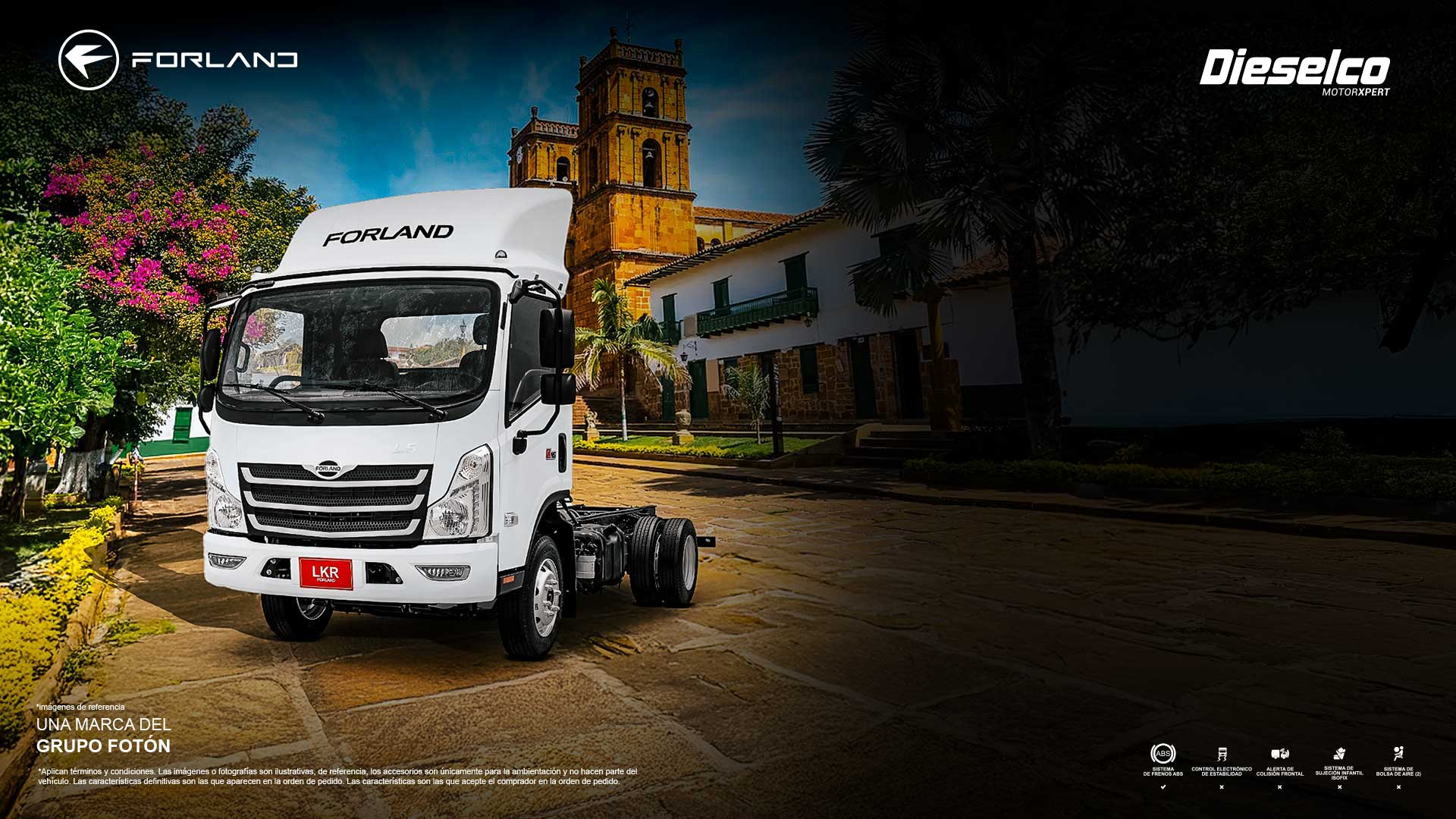 Camión Forland en carretera con paisaje de palmas que cuenta con una carrocería de estaca